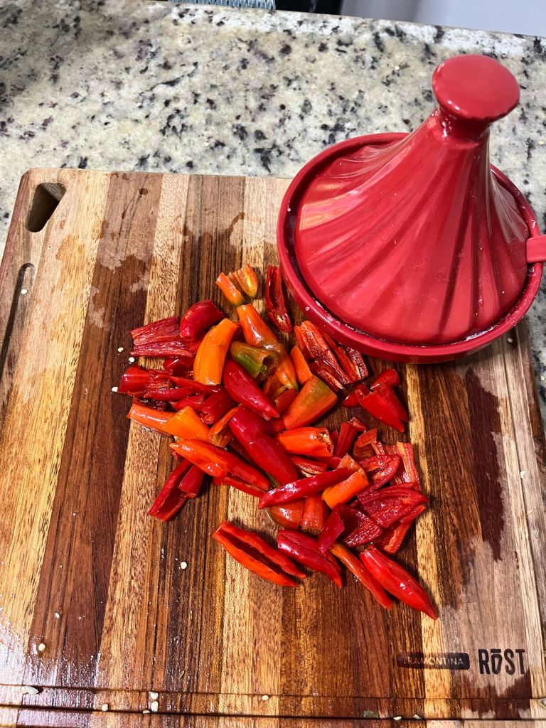 A harissa é uma pasta originária do norte da África (especialmente Tunísia e Marrocos), feita com pimentas vermelhas, alho, especiarias e azeite de oliva. Além do sabor marcante e picante, ela carrega uma riqueza nutricional que pode fortalecer o sistema imunológico, melhorar a circulação sanguínea e até reduzir inflamações no corpo. Essa receita é uma delícia, e bem forte de pimenta, usando as medidas abaixo o rendimento foi de 400 gramas, dividi em dois potes de 200ml, deixei um na geladeira e outro congelei. Aproveitei para adicionar essa pasta aos molhos, como o molho de tomate, mas atenção, uma colher de café já é suficiente para sentir a picância. Dicas: Lembre-se de utilizar luvas nas duas mãos para evitar se queimar, também é importante que o ambiente esteja bem ventilado. Retire as sementes para ficar menos picante!