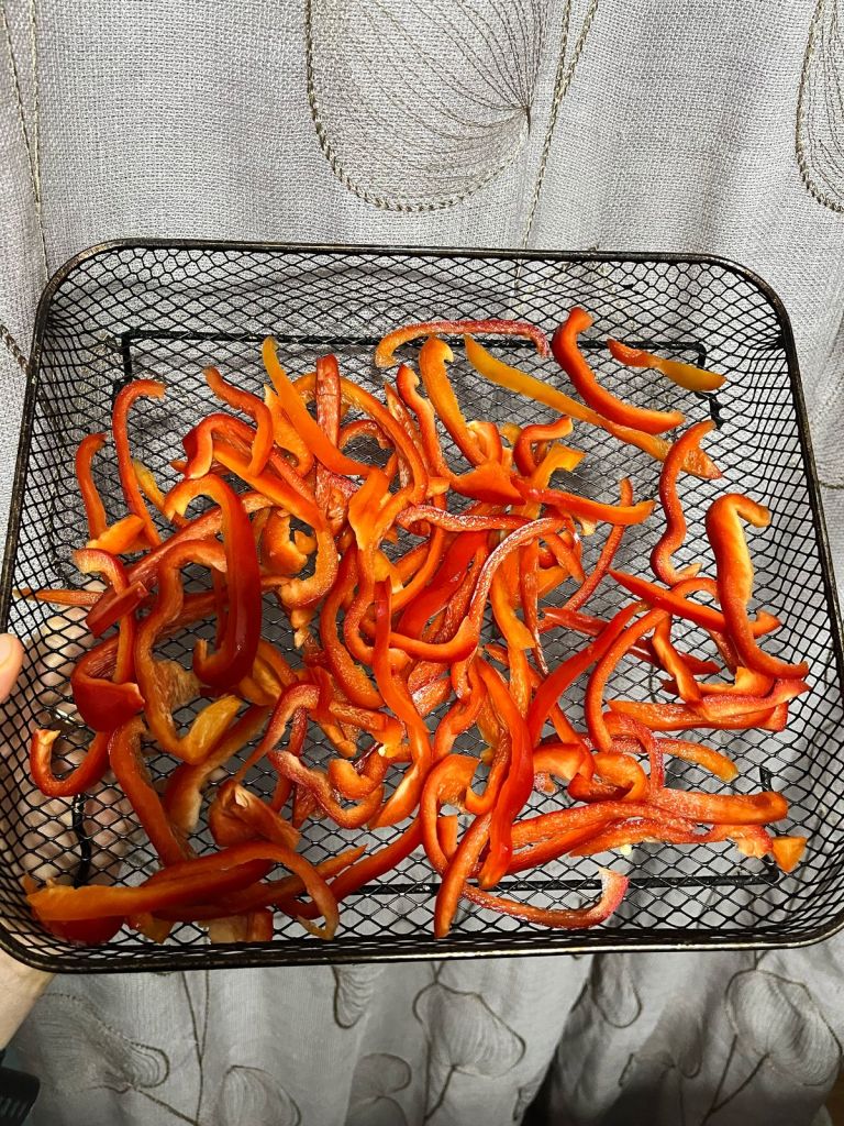 Se os pimentões tiverem muita água vai demorar mais o processo, você pode colocar em um pano de algodão ou voal e drenar os líquidos apertando bem, após leve ao forno pré -aquecido na opção desidratar cerca de 3 h a 40° mexendo de tempos em tempos, ou colocar na opção forno por cerca de 1h a 120° graus mexendo para não queimar, a ideia aqui é retirar todo o líquido sem queimar.