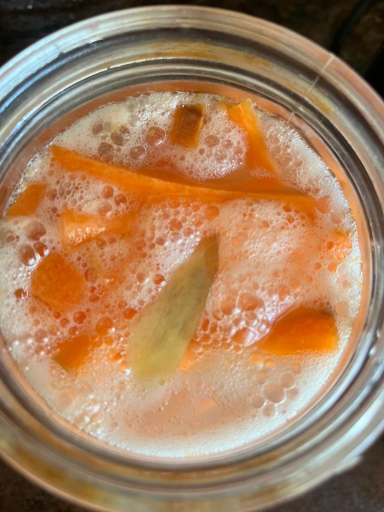Deixe as cenouras no vidro e tome diariamente uma porção do líquido, cerca de 10-20 ml e observe como seu corpo reage, ela ficará um líquido turvo salgado, usar gengibre em pequena quantidade ou cascas de laranja ajudará a saborizar.