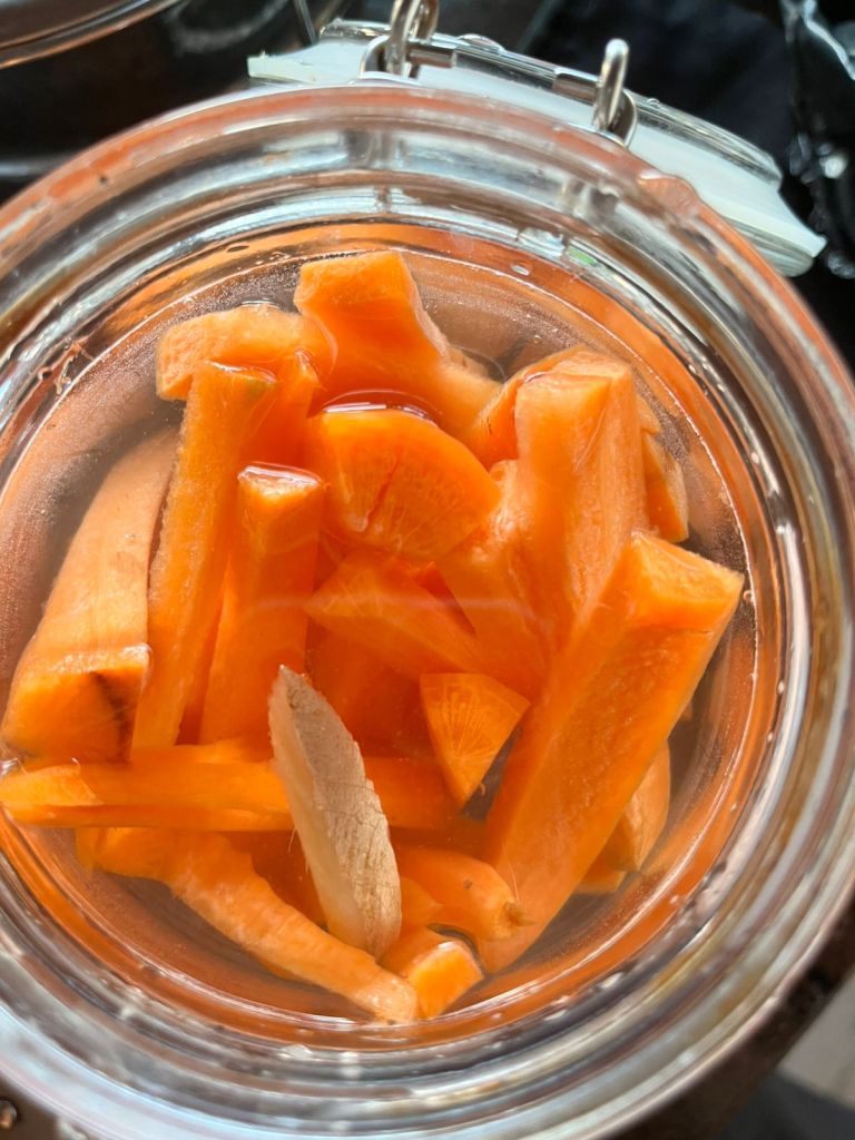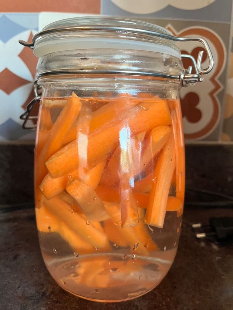 - Use salmoura natural ou massageie as cenouras com sal até soltar líquido;