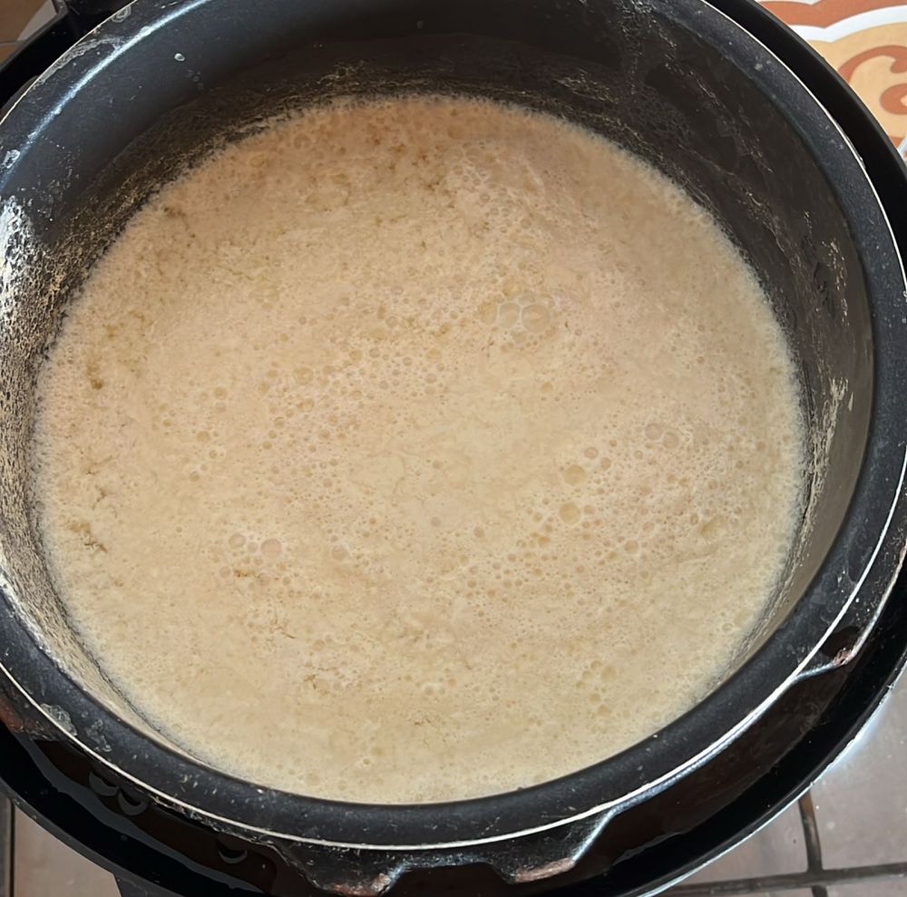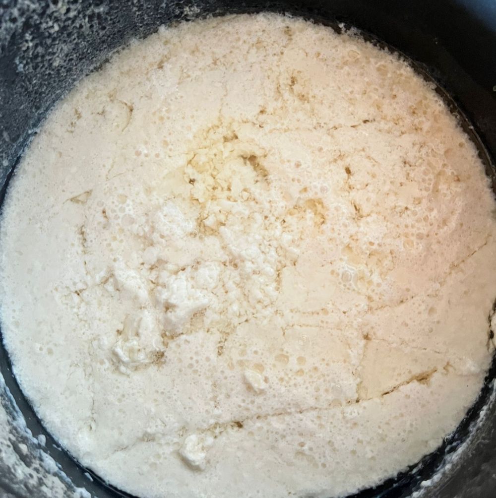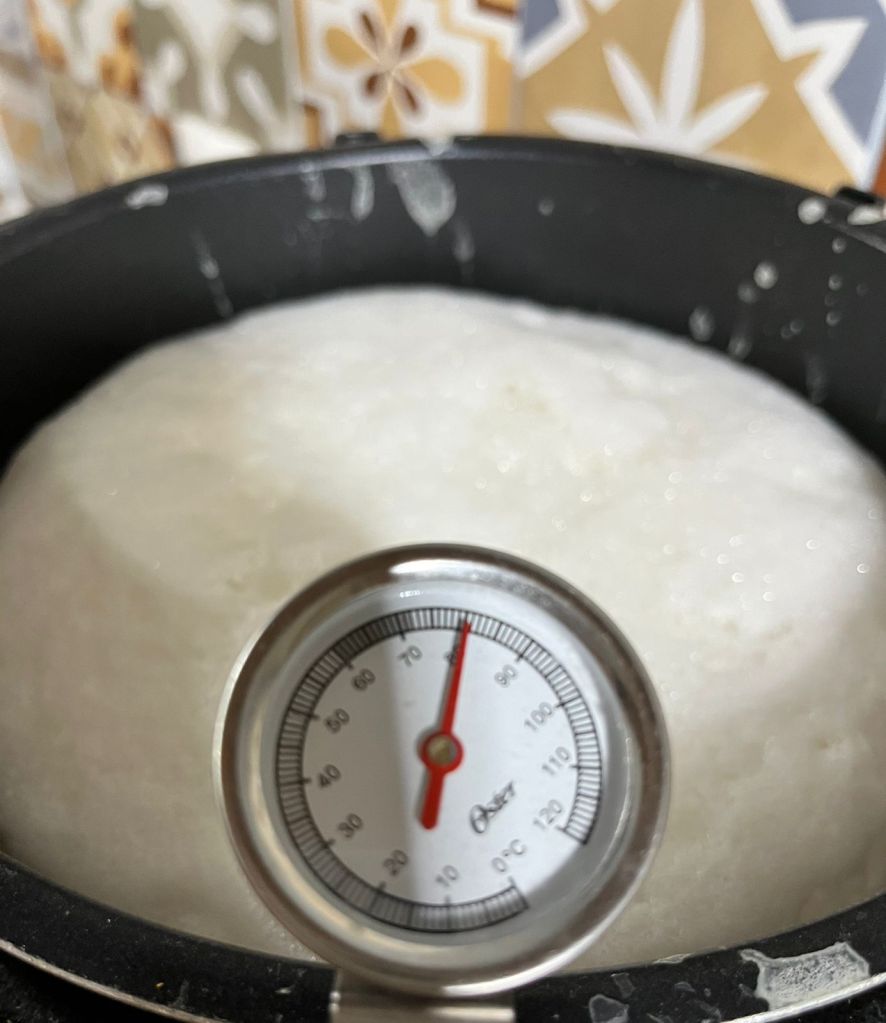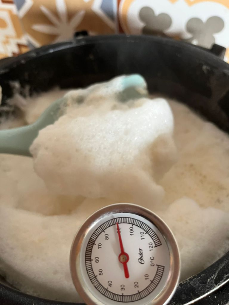 - Aqueça até quase ferver (você pode separar esse leite e usar em cafés, bolos…) (o ponto ideal é entre 80-90 graus não passando disso, geralmente leva em torno de 15 minutos a 18min);