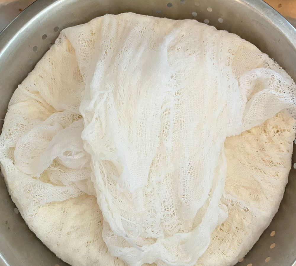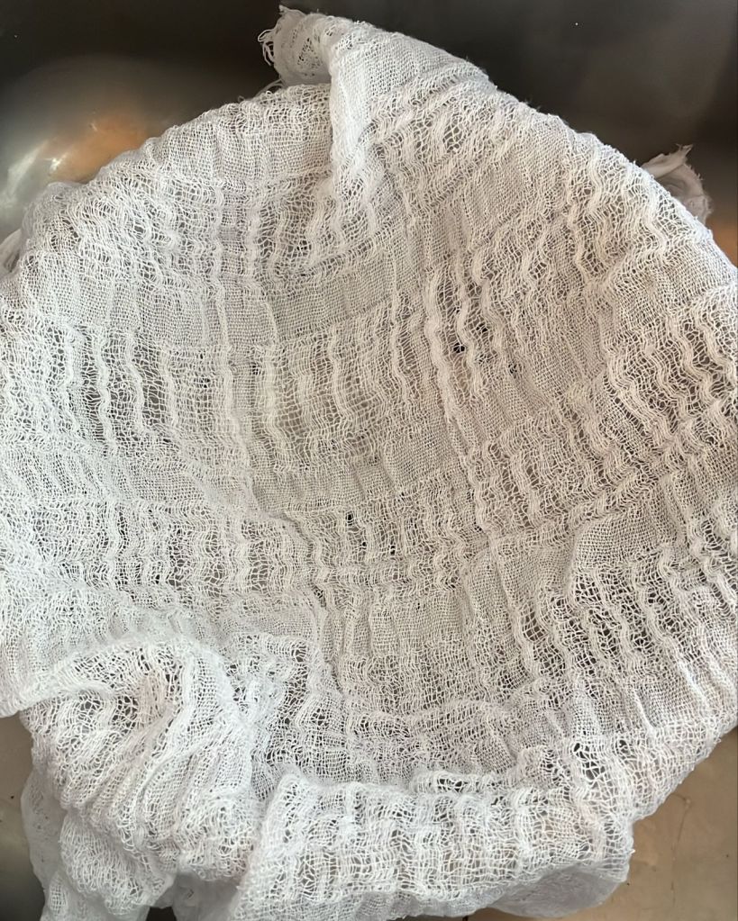 - Espere mais um pouco se estiver muito quente, prepare um recipiente como uma forma de queijos com furos ou escorredor de macarrão de inox adicione o pano para coar e deixe lá escorrendo por 3 a 5 minutos;