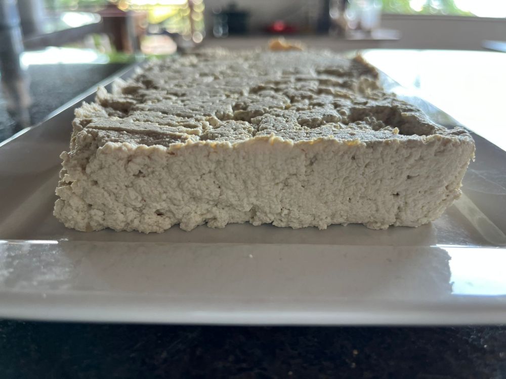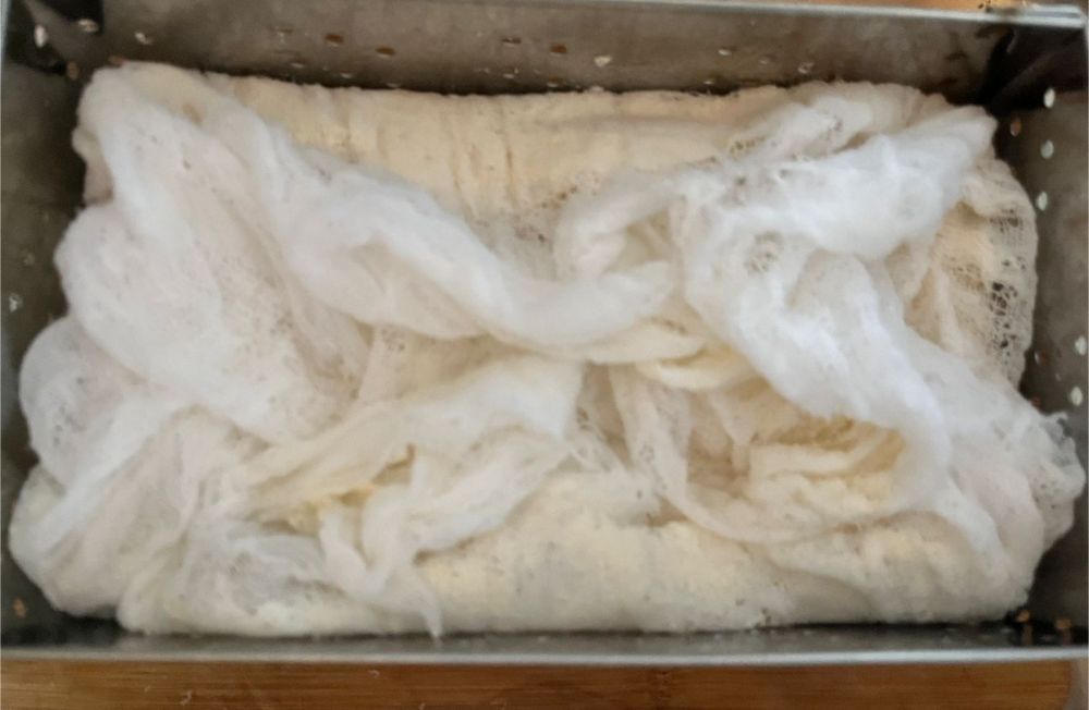 Comprei uma forma retangular de queijo tamanho G para fazer um tofu mais sequinho e retangular, funcionou bem! Coloco a gaze dentro da forma, mas como ela é aberta embaixo coloquei uma tábua de bambu, forma em cima, tecido e despejo o tofu com cuidado que ainda está quente, espero 3 min cubro com o pano e coloco a parte de madeira e pressiono, na sequência coloco peso em cima e deixei por 4h assim.