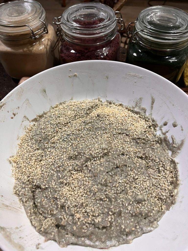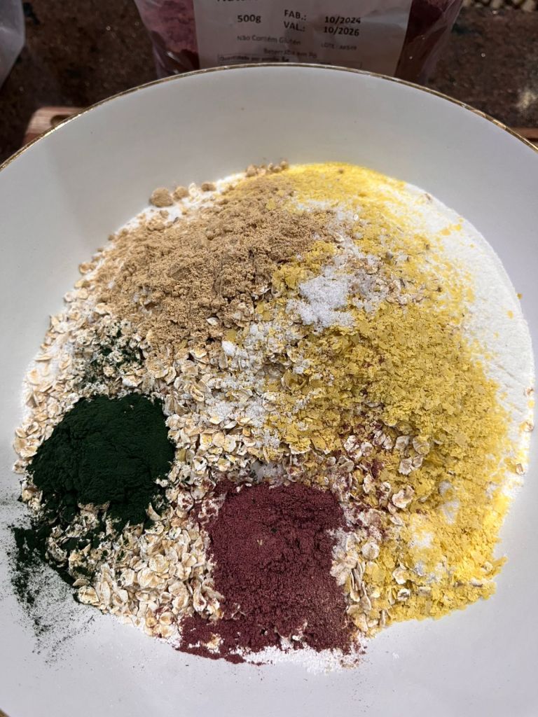 Misturar secos: farinha de arroz, polvilho, farinha de amêndoas, aveia, psyllium, sal + os funcionais (spirulina, maca, beterraba, levedura, linhaça/chia).