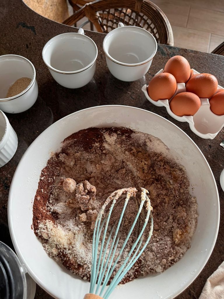 Acrescente as farinhas (amêndoas, arroz, coco), o psyllium, a chia/linhaça, a maca e o cacau. Misture.