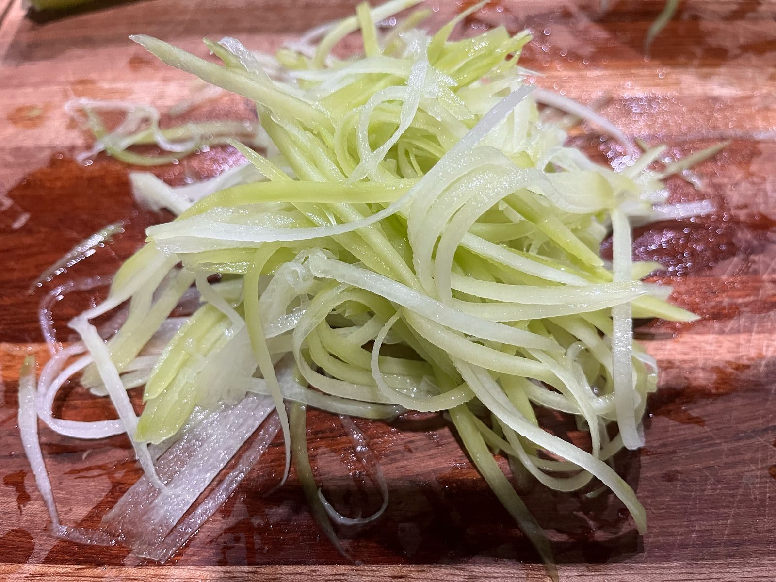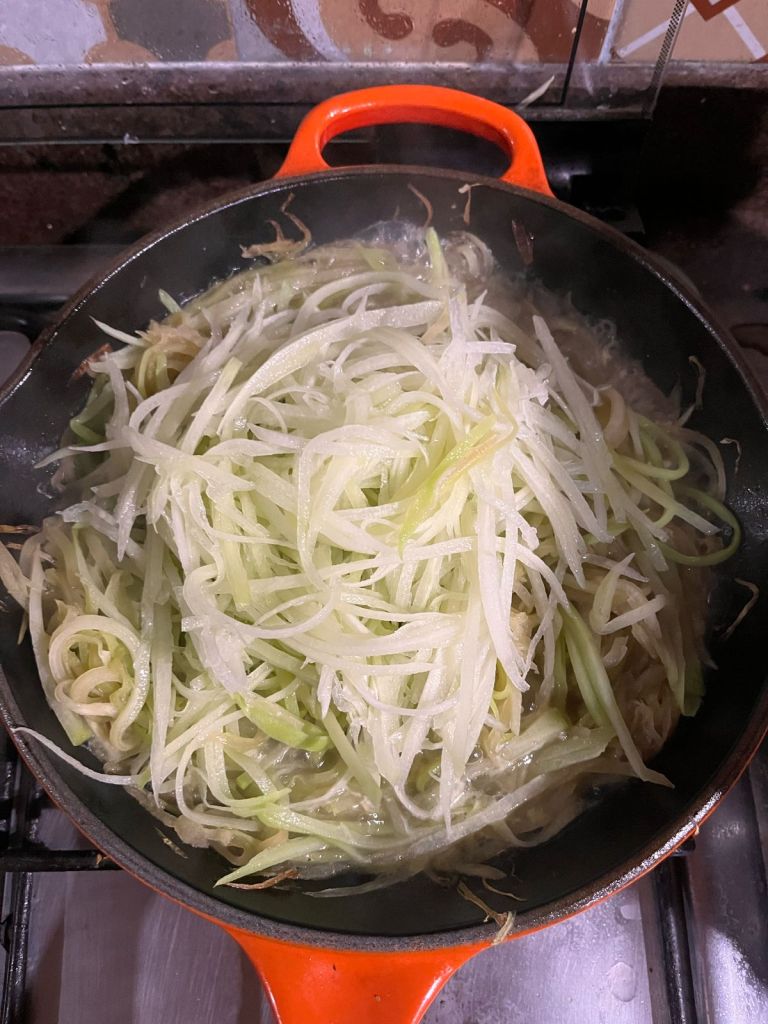 - Lave, descasque e corte o chuchu em tiras finas no estilo espaguete (com descascador ou ralador);