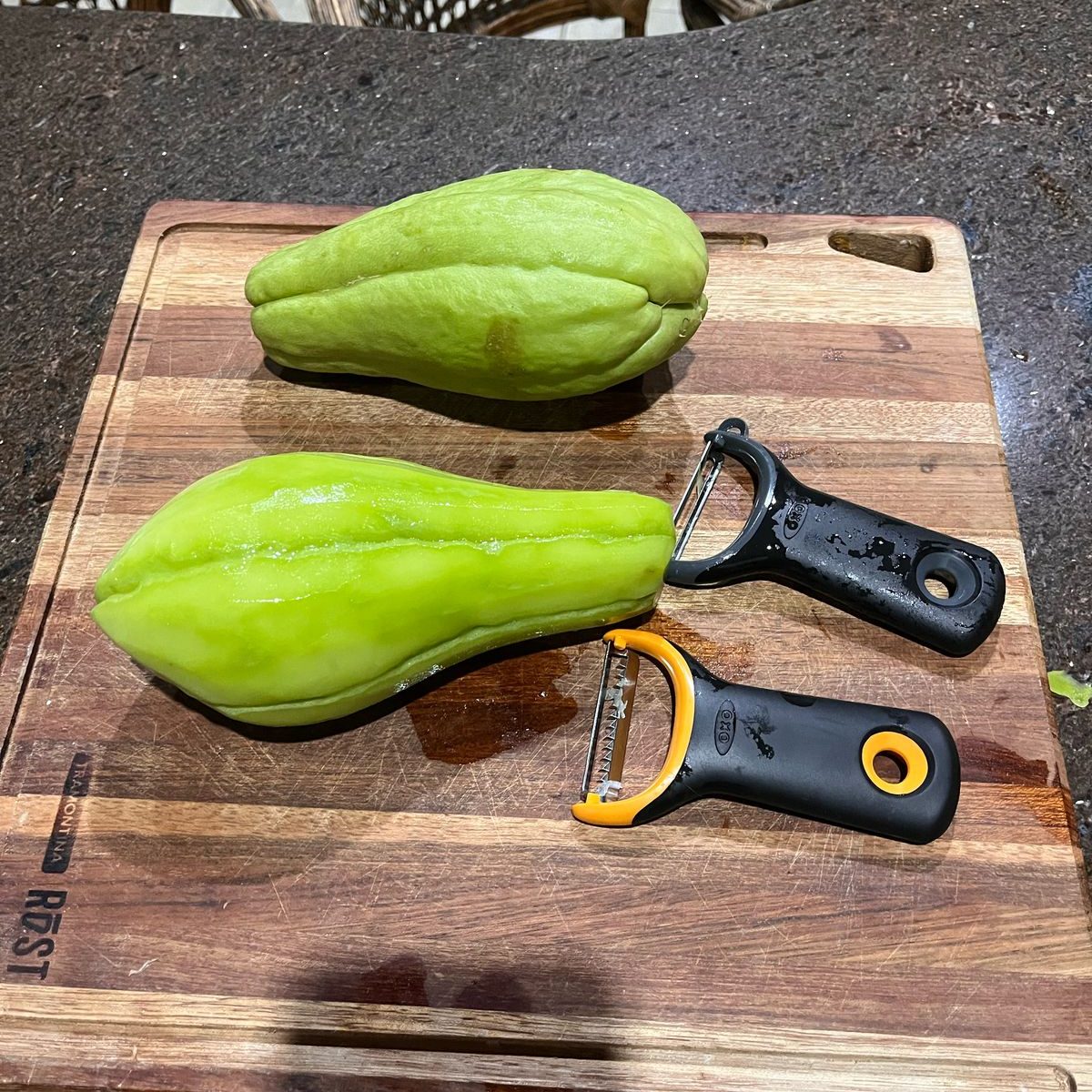 - Opcional de casca: como os alimentos são orgânicos, você pode optar por manter a casca, mas no caso do chuchu, eu prefiro remover.