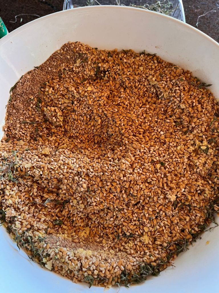 Misture todos os ingredientes secos em uma tigela: linhaça, gergelim, levedura nutricional, psyllium, sal e tomilho.
