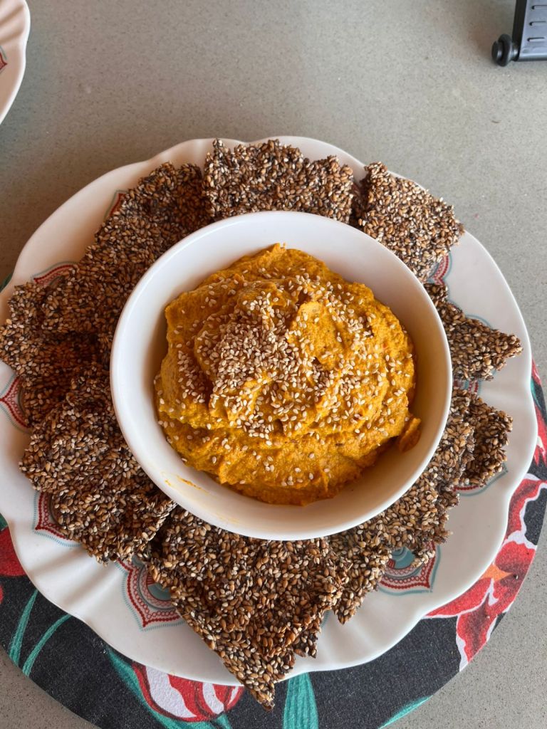 No processador de alimentos adicione todos os ingredientes as cenouras cozidas, as sementes, o alho, castanha de caju, sal, vinagre e azeite bata tudo até misturar bem. Regue com azeite e sirva com biscoitos, ervas e hortaliças.