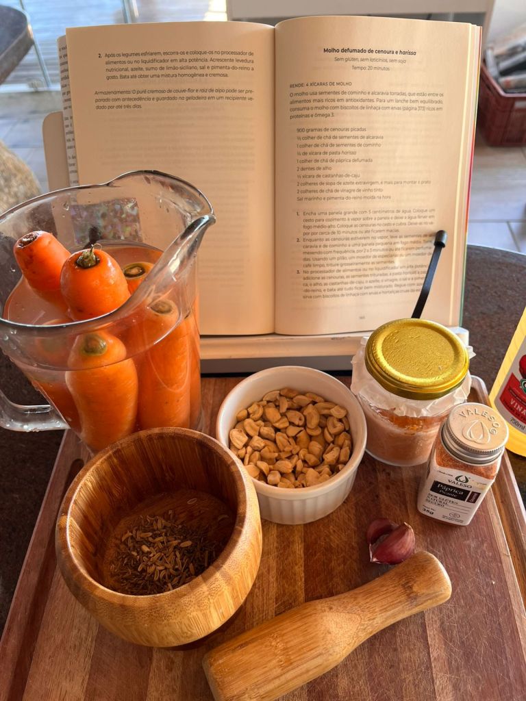 Hoje resolvi preparar uma receita de uma médica que admiro muito: a Dra. Casey Means. Ela é autora do livro Good Energy, uma obra incrível que reúne ciência, bem-estar e também algumas receitas especiais. Entre elas está o molho de cenoura defumado, que vou compartilhar aqui com vocês. 🥕🔥 Esse molho é nutritivo, picante e cheio de sabor — perfeito para acompanhar palitos de cenoura ou pepino, ou ainda servir com torradinhas caseiras. Uma daquelas receitas simples, mas que surpreendem no resultado!