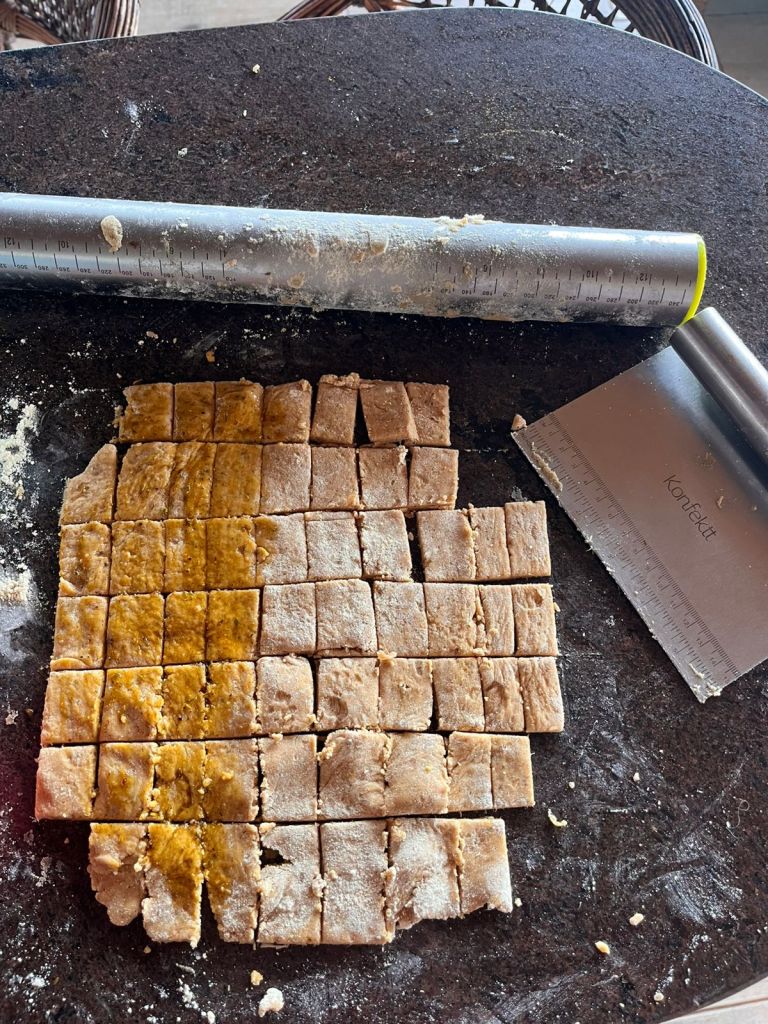 - Unte levemente uma bancada, abra uma parte da massa com auxílio de um rolo enfarinhado e deixe na espessura desejada.