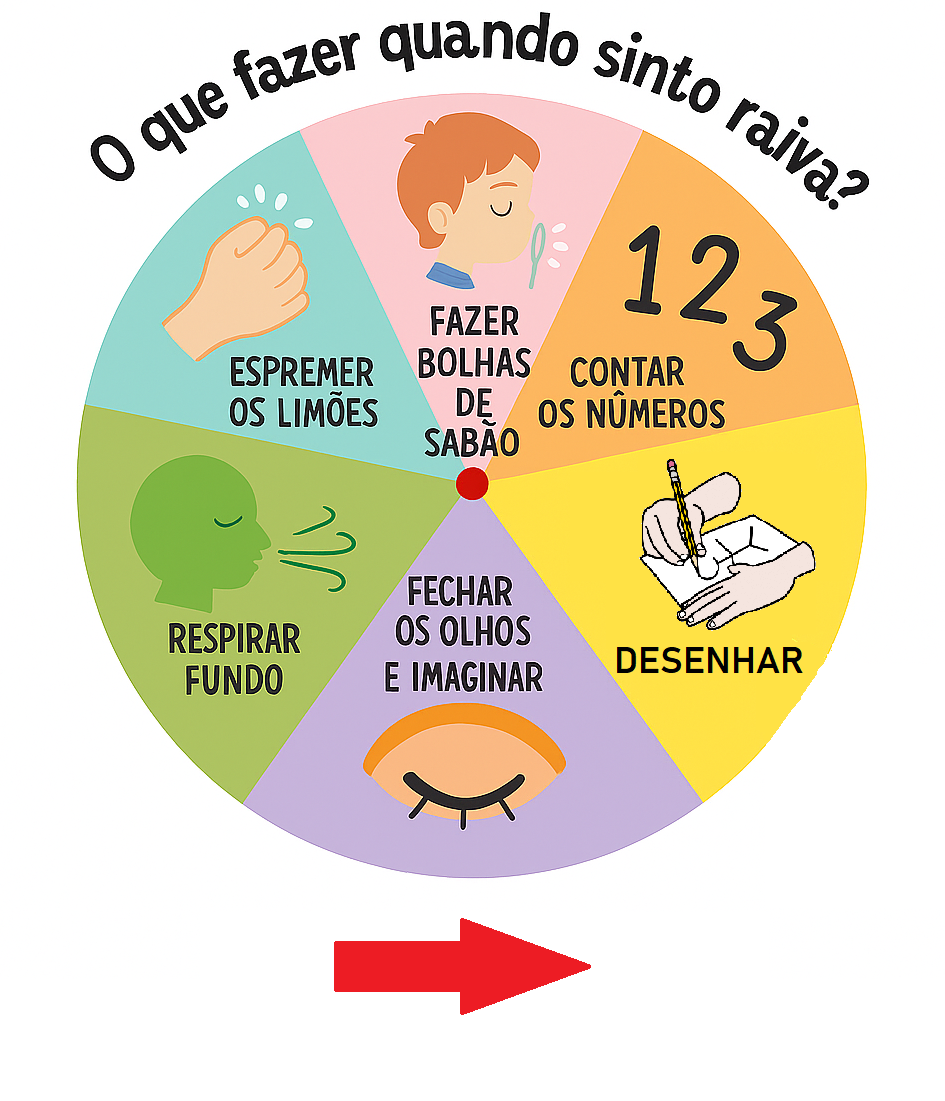 - Ajude a nomear, o que você está sentindo se chama raiva: use roletas de emoções, imagens, contação de histórias. Crianças com mais repertório identificam melhor o que sentem.