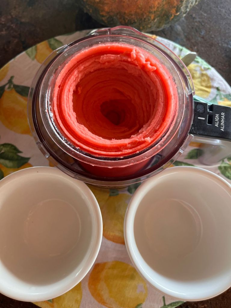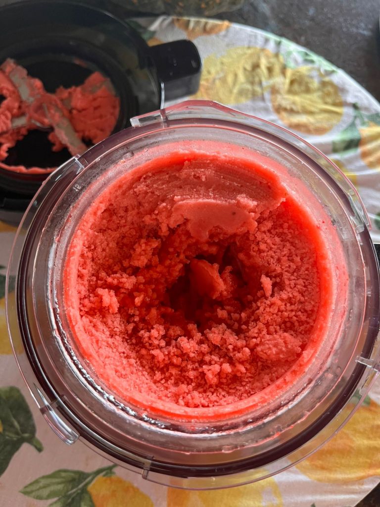 Bata tudo, congele e após leve à sorveteira. Escolha a opção sorbet, se ficar esfarelado, adicione 30 ml de água ou menos e coloque na opção gire novamente.