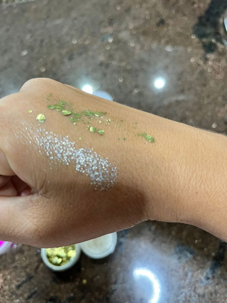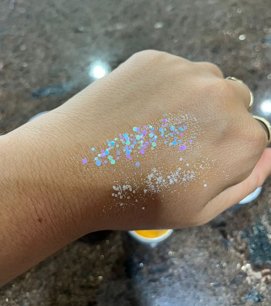 Nada de cola, nada de esfregar a pele, nada de dor — bem diferente de quando eu usava glitter tradicional, que exigia produtos mais agressivos para sair.
