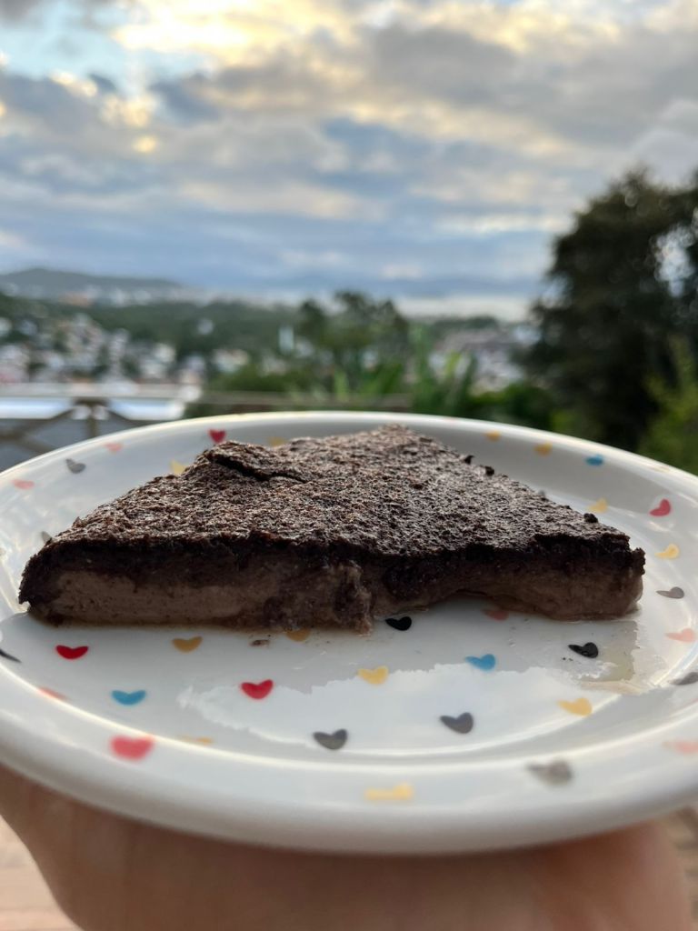 Ele não é excessivamente doce, não é pesado, e fica com uma textura levemente mais úmida — quase um encontro entre pudim e flan.